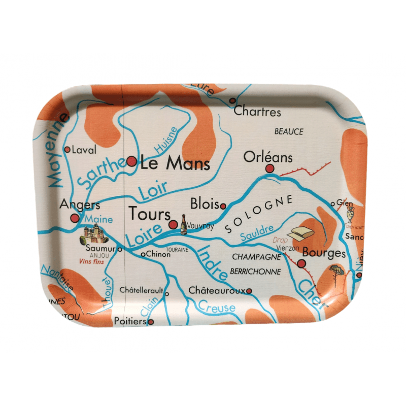 On adore le côté vintage de ce plateau reprenant nos affiches scolaires géographiques.